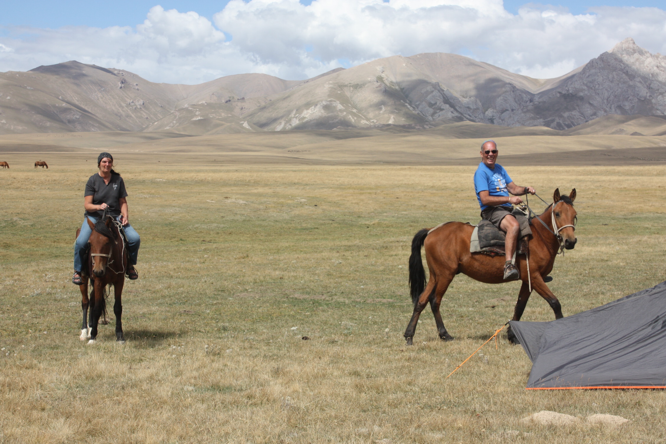 Horse-riding at Lake Song-Köl in Kyrgyzstan. Norm swears he can control a horse, but Lin isn't so sure.