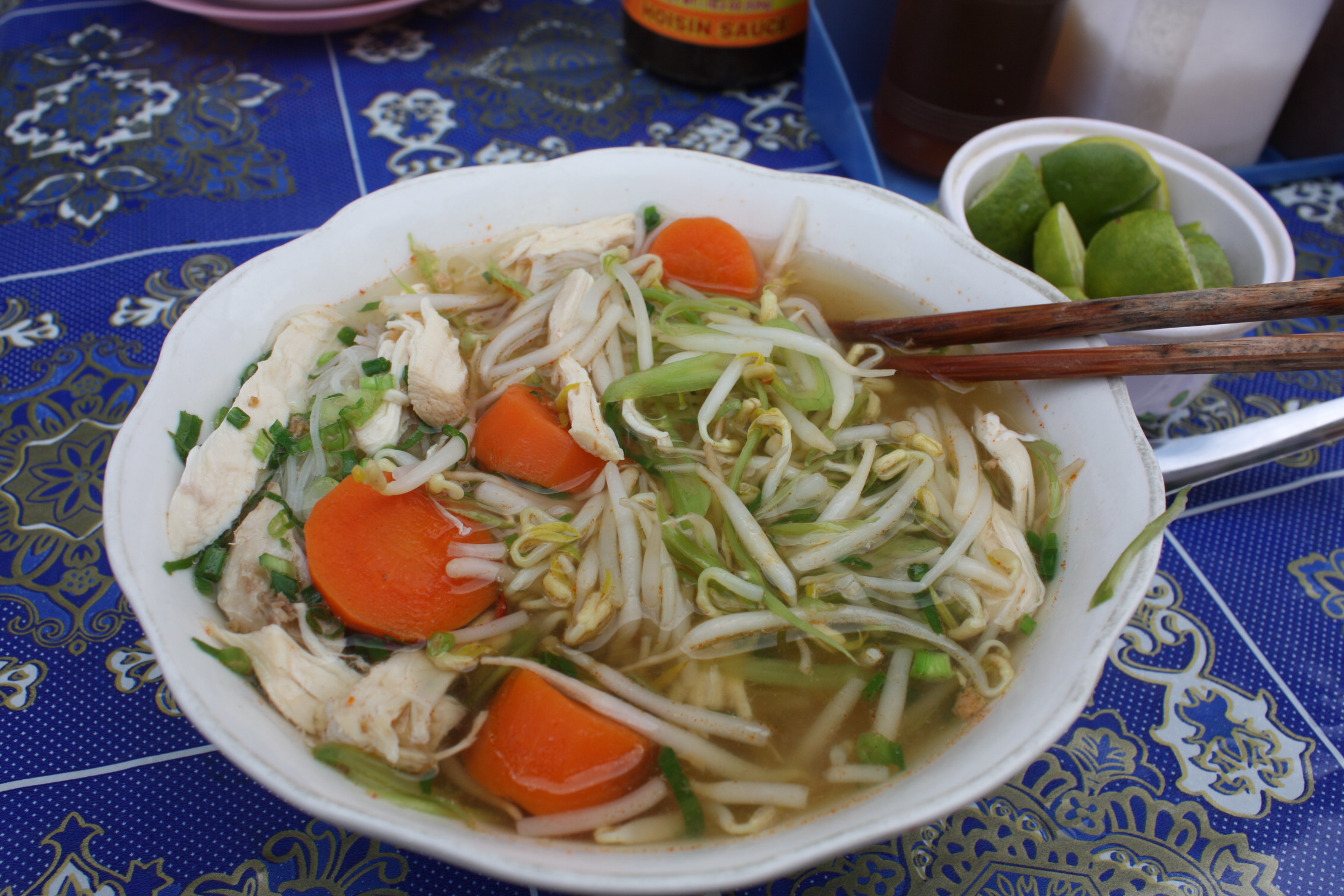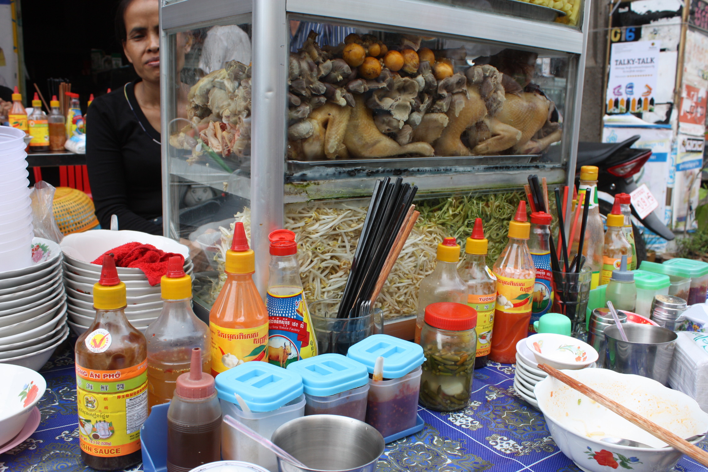 It’s amazing how such lovely food can be produced on a lone burner and in a space not much bigger than a tea trolley. We ordered two soups—one with chicken and the other beef. You can spice up a dish to your liking. At least half the stall’s ‘table’ is devoted to an incredible array of condiments.