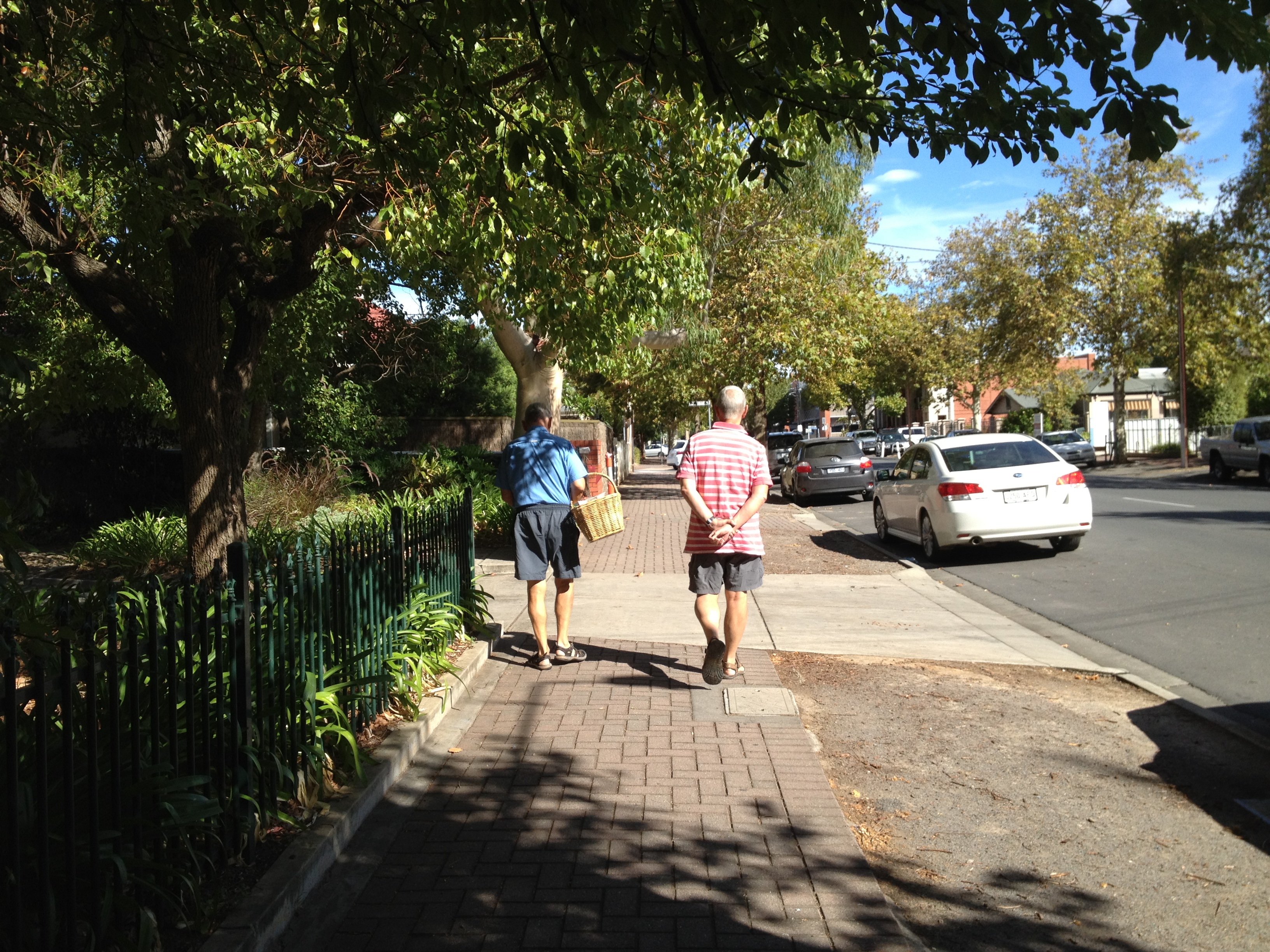 In the second pic, here on the left, Poor John is carrying a wicker shopping basket so can’t fold his hands behind his back, but empty-handed David can!
