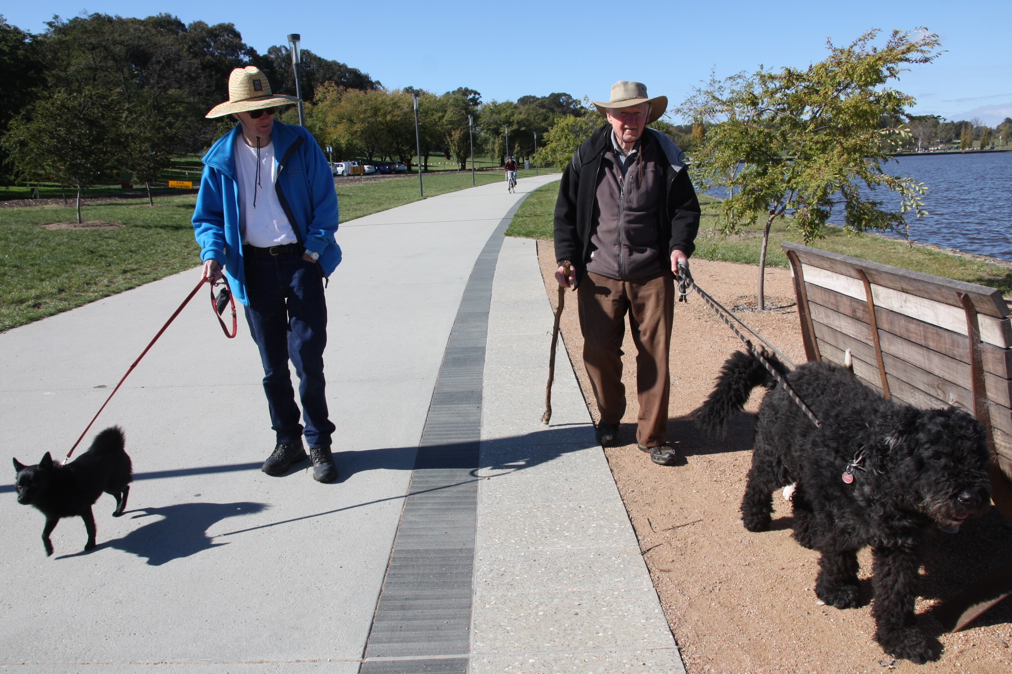 So eight ‘parents’ and 10 dogs gathered at Blundell’s Cottage, which is near the Carillon. After each pooch got a bit of Smacko, we set off westward along the RG Menzies Walk.