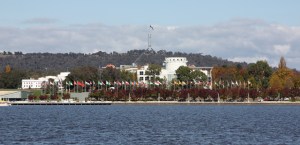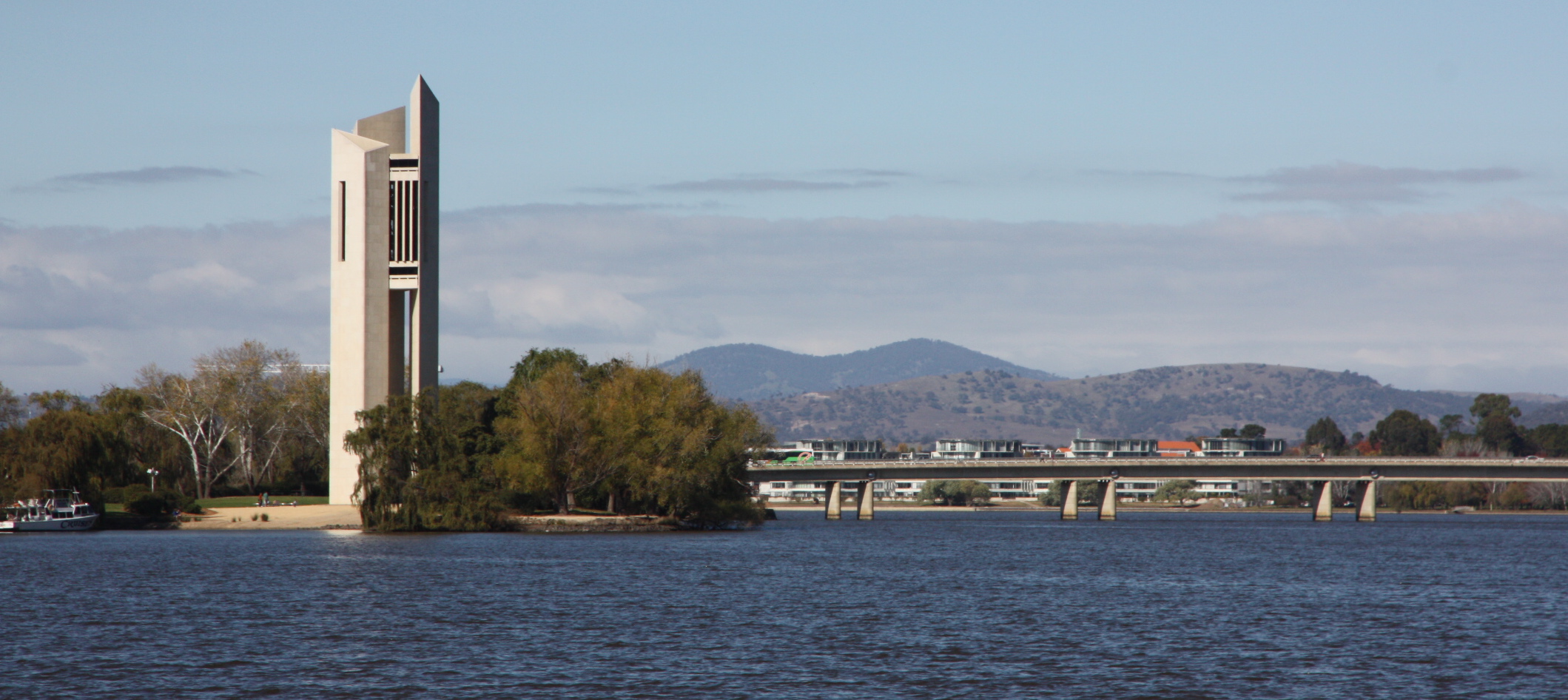 Aspen Island and the National Carillon—a present from the British government to Australia on the 50th anniversary of Canberra’s creation. Kings Avenue Bridge is on the right. The Carillon has 55 bells that chime the quarter hours and play a tune on the hours. There are regular concerts, and we can hear the Carillon from our house.