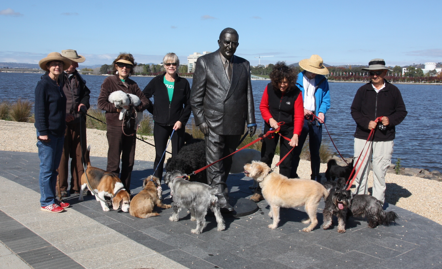 We did, however, manage to gather by the statue of RG Menzies himself, out for a stroll but without a pooch. So we looped Maggie’s lead over his hand and got a group shot of the mayhem. I’m missing because I’m the photographer.