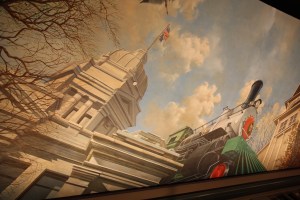 Ceiling mural features the courthouse and railway