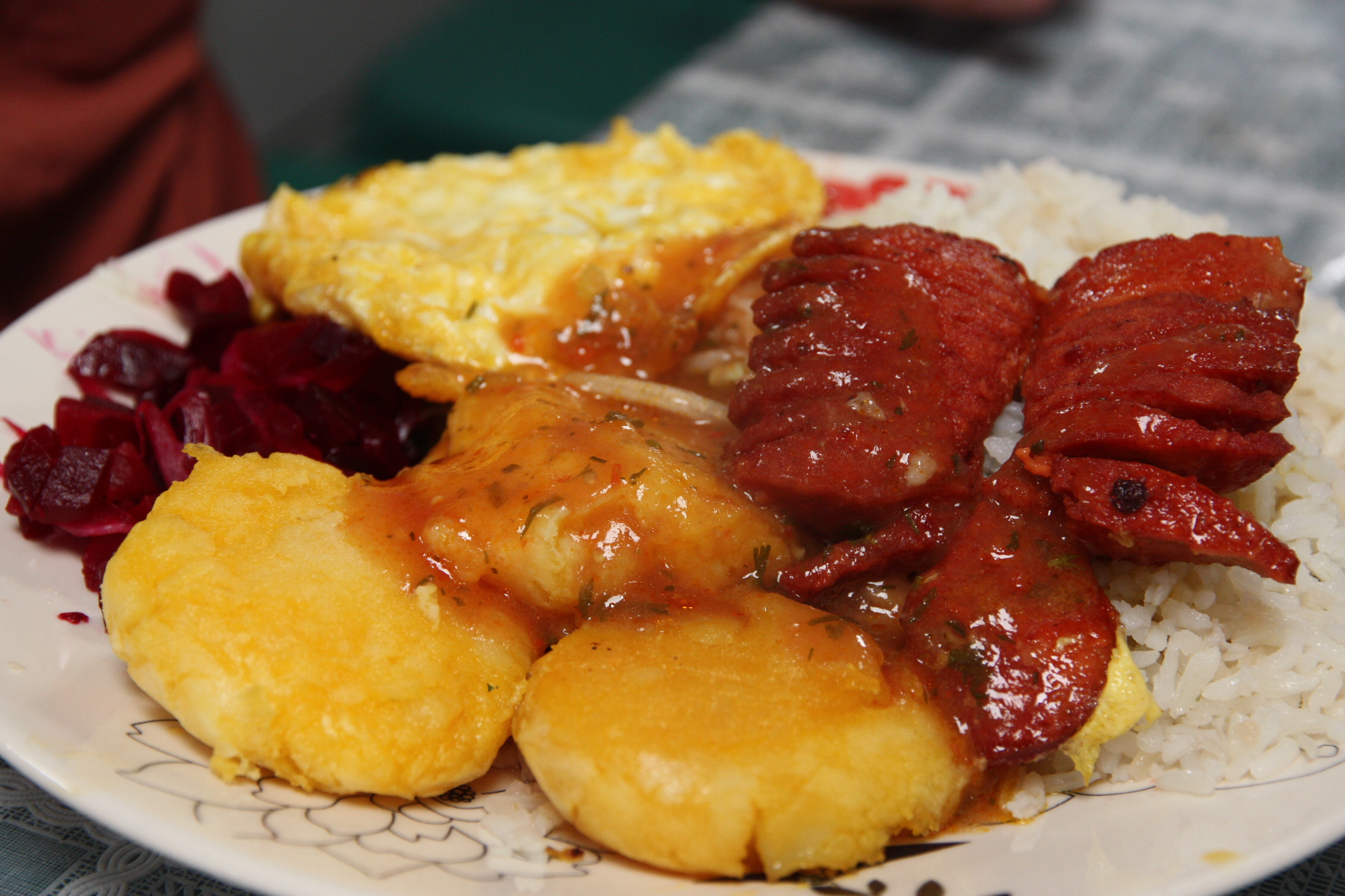 The meal includes a chorizo sausage, rice, a fried egg, three potato pancakes and three varieties of salad—lettuce, tomato and beetroot. The woman who ran the stall threw in a special extra for the gringoes—a mixture of pork (we think) and beans.
