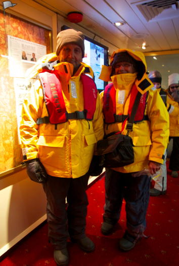 We were shown the ‘fireman’s grip’ or maybe it was called the ‘get in the Zodiac’ grip. It’s how the crew members who are there to help you to embark or disembark will grab your arm (gently but firmly) to guide you into or out of the Zodiac. The step up or down is about 12-15 inches, and you have two or three people hanging on to you—helping you.