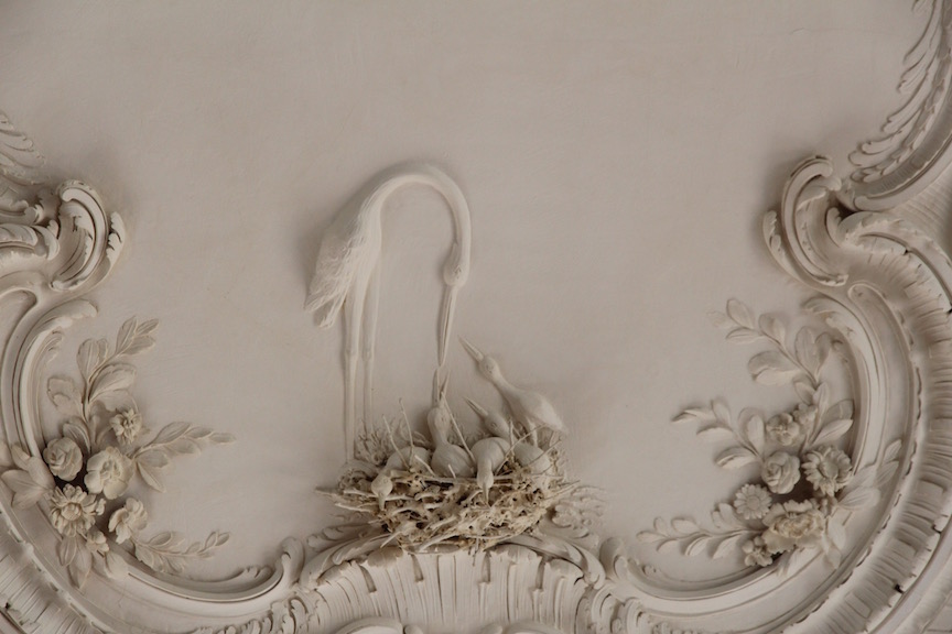 Rundāle Palace, White Hal, stork on ceiling