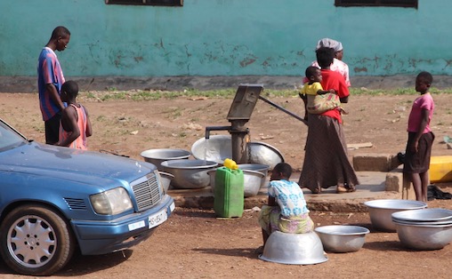 Pumping water with a baby on a hip/back