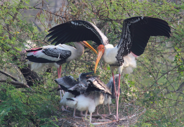 Chicks are exceptionally noisy, and we heard them before we saw them. They use loud, hoarse calls to let their folks know they are plenty hungry. Mum and dad gather fish (a painted stork’s favourite food), which they later regurgitate for the chicks. Parents are obviously quite protective of their young. We saw them standing with wings outstretched to shield the little ones from the heat of the day.