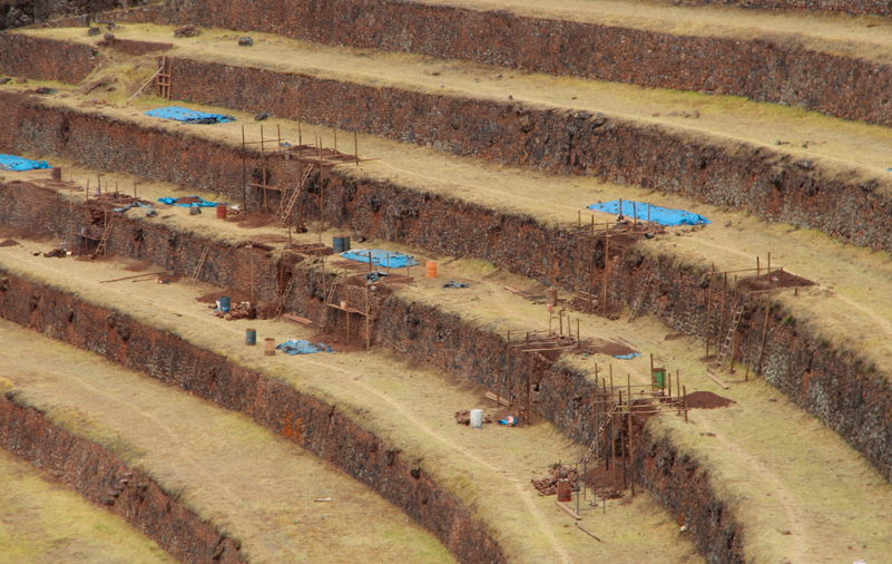 The terraces, built from stone and compacted earth, suffered extensive damage a few years ago when the Cusco region had unprecedented rainfall. Part of the main Moray circle collapsed and reconstruction is currently underway.