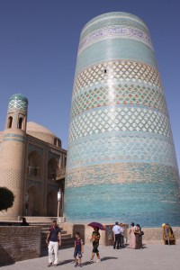 The turquoise is especially evident on the Minaret Kalta-Miner, the large blue tower in the central city square. The structure was supposed to be the largest minaret in Muslim Asia, with a base of 14 metres and a height of 70–80 metres, but the ruling Khan died in 1855 and the succeeding Khan stopped construction. One theory is that he thought the minaret would overlook his harem and the muezzin would be able to look down on his wives. Another theory, which I prefer, is that the Emir of Bukhara also wanted such a minaret and negotiated with the master builder to do a second one in Bukhara. The Khan of Khiva was supposedly outraged by this deal and ordered that the builder be killed when the first minaret was completed. The builder heard of this and skedaddled. Good builder, smart man.