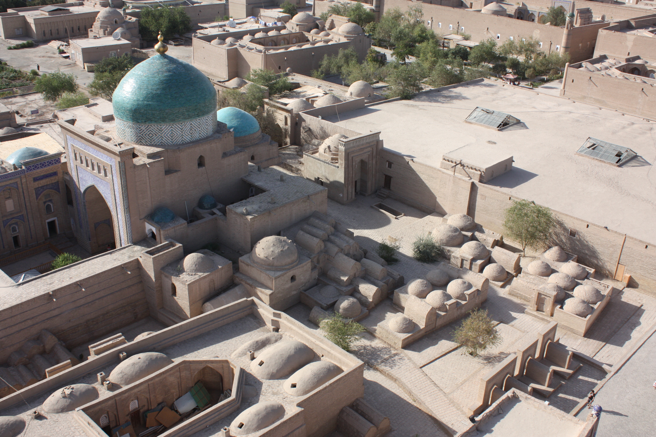 We got a bird’s eye view of the Pakhlavan Mahmoud Mausoleum. Built in the early 1800s, it commemorates a personality who died in 1325. Pakhlavan Mahmoud was a Persian Sufi teacher, as well as a gymnast and wrestler known as the Hercules of Asia. He was considered a patron saint of Khiva and made the protector of his descendants, who ruled Khiva as the Kungrad Dynasty of the 19th century.
